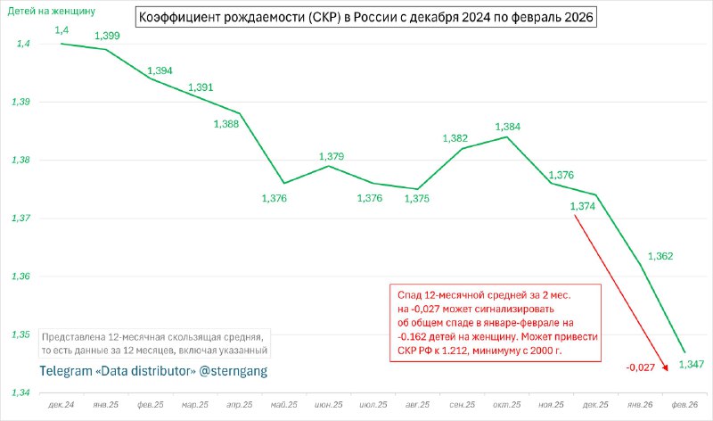 Спад коэффициента рождаемости в России ускоряется — по итогам 2026 г. он может достичь 1.212 детей, минимума за 26 лет Негативные тенденции по коэффициенту рождаемости (СКР) в России, зафиксированные