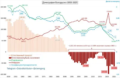 Число родившихся в Беларуси за 37 лет сократилось втрое, рождаемость достигла 1.0, при этом естественная убыль с 1993 г. составила 12% населения С 2020 г. Белстат перестал публиковать демографическую