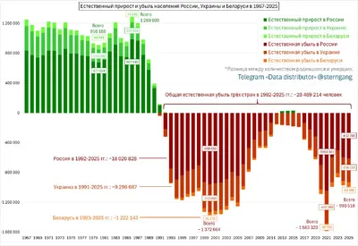 Естественная убыль населения в России, Украине и Беларуси за 34 года достигла 28.5 млн человек Страны с преимущественно восточнославянским населением, Россия, Украина и Беларусь, переживают глубочайш