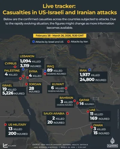 Число погибших в конфликте на Ближнем Востоке уже исчисляется тысячами и продолжает расти, затрагивая сразу несколько стран региона. Об этом свидетельствуют данные, опубликованные Al Jazeera на основе