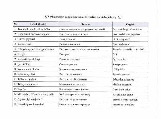⚡️💳 ВАЖНО: Теперь при переводе денег нужно будет указывать, кому и за что! В Узбекистане при отправке средств через мобильные приложения (Payme, Click и т.д) станет обязательным выбор цели перевода.