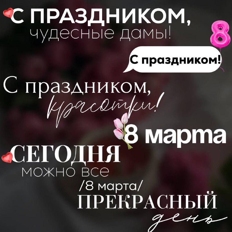 Дорогие девушки!💗 Поздравляю вас с Международным женским днём! Пусть в вашей жизни всегда будет место для радости, вдохновения и любви. Пусть каждый день приносит улыбки, тёплые слова и приятные мо