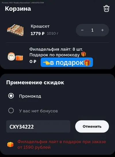 Ролл за 0₽ и другие скидки в доставке Farfor по промокодам🔥 Действуют до 31 марта. Выбираем подходящий промик и применяем в корзине. На самовывоз тоже пройдут. 🎟Промокоды: CXY34222 — Ролл «Филад