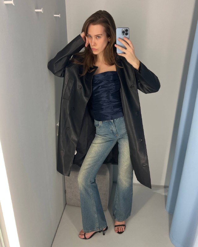 Встречаем весну красиво💙 Аннушка в примерочной ТЦ «АВИАПАРК» в образе с корсетом, джинсами и тренчем из экокожи (который, по секрету, должен скоро поступить👀).