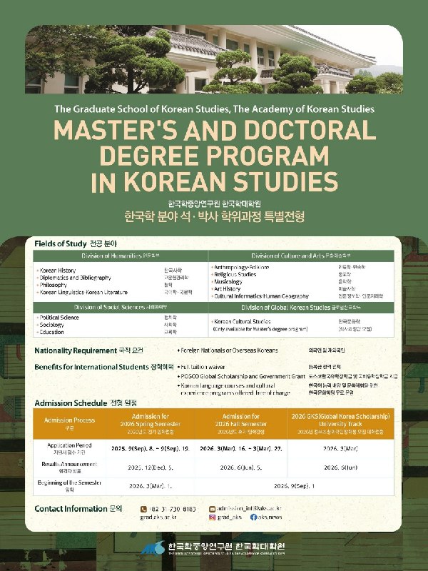 Грант на обучение в Южной Корее 🇰🇷 📍Где: The Academy of Korean Studies (AKS), Южная Корея 👥Для кого Для иностранных студентов, поступающих на магистратуру (Master’s) и докторантуру (Ph.D.) в Gra