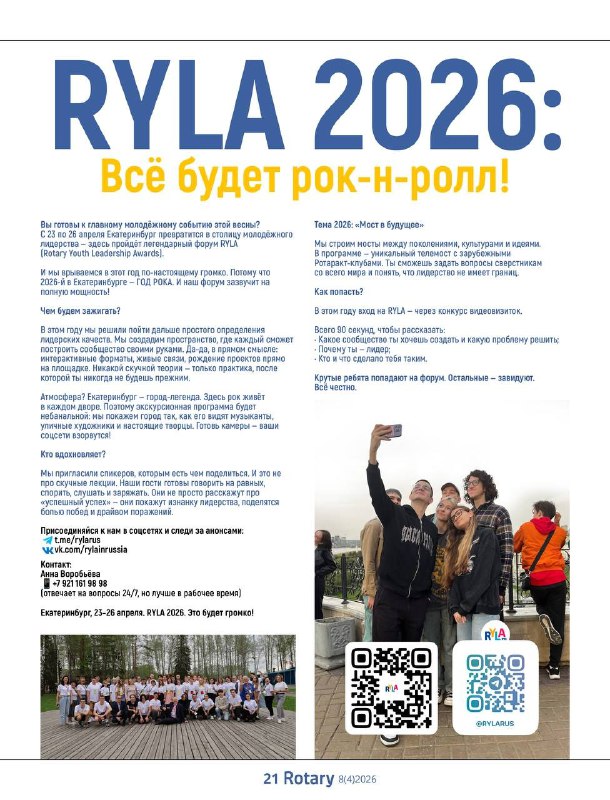 Международный молодёжный лидерский форум Rotary Youth Leadership Awards (RYLA) 📍Где: в Екатеринбурге 📅Когда: с 23 по 25 апреля 2026 года 👥Для кого Молодёжь 16–30 лет из России и стран СНГ. Отбо