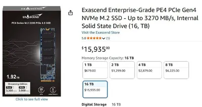 Наконец доступен M.2 SSD на ШЕСТНАДЦАТЬ ТБ всего за $16.000! Это почти тысяча баксов за терабайт. Скорость чтения у Exascend PE4 до 3270 МБ/с, а скорость записи — до 2980 МБ/с. Скоро терабайт будет