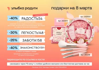 Промокоды для онлайн-заказов в Улыбке Радуги💥 ✅ РАДОСТЬ54 - скидка 40% на каждый заказ от 1500 ₽. ⏰️ Действует только с 5 по 8 марта! Сработает на все товары, в том числе со скидками, при условии,