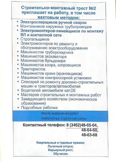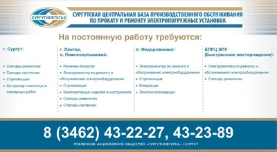 В Сургутское Тампонажное управление требуется: - Механик (г Сургут, г.Лянтор), образование АТХ - Машинист автокрана (г.Сургут) - Электромонтер По результатам собеседования принимается решение о разм
