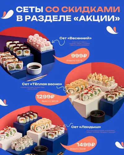 Новые сеты со скидками в разделе «Акции»👇 🥢Сет «Весенний» за 999₽, вместо 1257₽ 3 ролла: Онтарио с лососем, Гейша с лососем, Лава со снежным крабом. 🥢Сет «Тёплая весна» за 1299₽, вместо 1652₽ 4 р