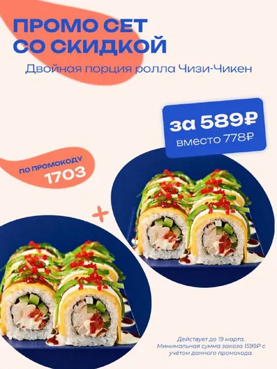 🔤🔡🔠🔡🔠🔡🔠🔤 специально для пользователей нашего мобильного приложения — двойная порция ролла со скидкой почти 25% 😎 🥢Двойной Чизи-Чикен за 589₽, вместо 778₽ По промокоду «1703» Действует до 19