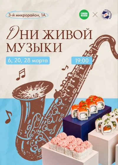 Ачинцы, крутая новость для вас 🎷🎶 Уже в эту пятницу, 20 марта в 19:00, приглашаем на вечер живой музыки — саксофон, любимые суши и атмосфера, в которую хочется возвращаться снова и снова ✨ Идеальны