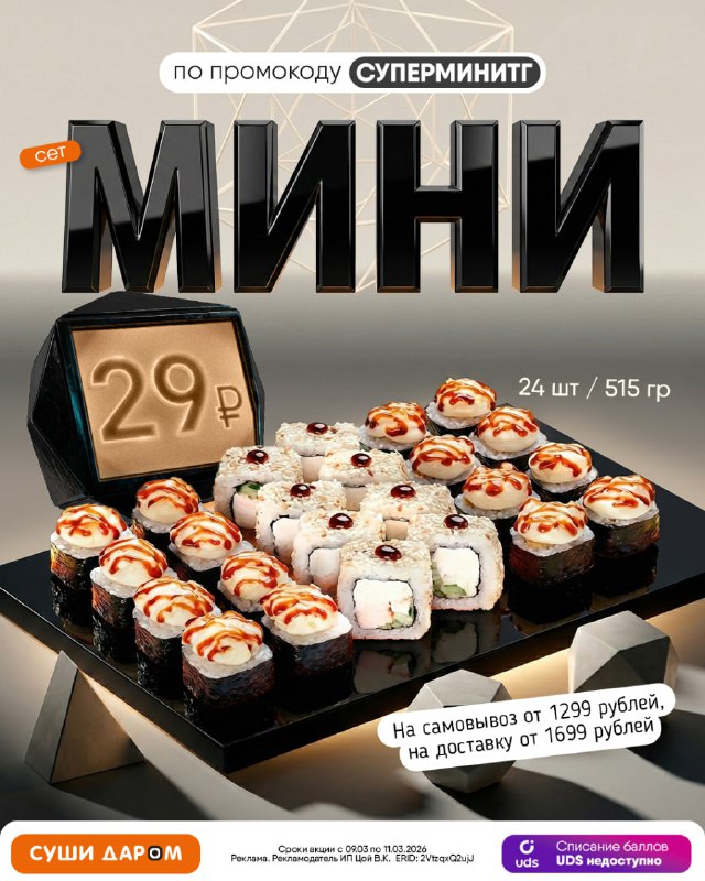 🔥 СЕТ «МИНИ» - ВСЕГО ЗА 29₽ Любишь, когда вкусно и выгодно? Тогда это знак 😎 24 шт / 515 гр - идеальный вариант для перекуса, встречи с друзьями или просто чтобы порадовать себя. 🎁 Промокод: СУПЕ