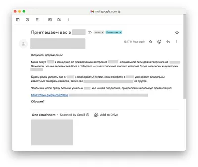 Как это письмо написала бы я → «Людмила, добрый день! Меня зовут Ольга, я менеджер по привлечению авторов в социальную сеть ХХХ. Нам нравится ваш канал, и мы заинтересованы, чтобы вы присоединились