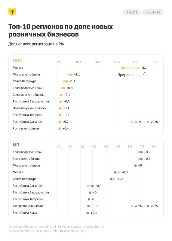 ❗️Свердловская область вошла в топ-5 регионов по количеству регистраций ООО в розничной торговле Об этом пишут «Ведомости» со ссылкой на исследование Т-Бизнеса. Так, в нашем регионе было зарегистриро