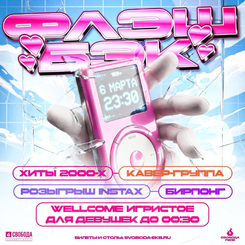 Флэш Бэк - дискотека 00х-10х в эту пятницу: сделай так, чтобы бывший пожалел, что удалил твой номер в 2009. Мы возвращаемся туда, где ты красилась блеском с блёстками, писала смс по 2 рубля за штук