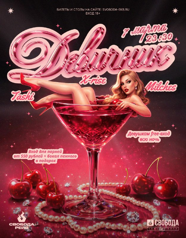 Смеяться громко, танцевать бесстыдно, флиртовать смело Сегодня ночью у нас Девичник! Ночь, где можно быть одновременно дерзкой хищницей и нежной добычей. Вишнёвые шоты на входе первым 50 богиням Сау