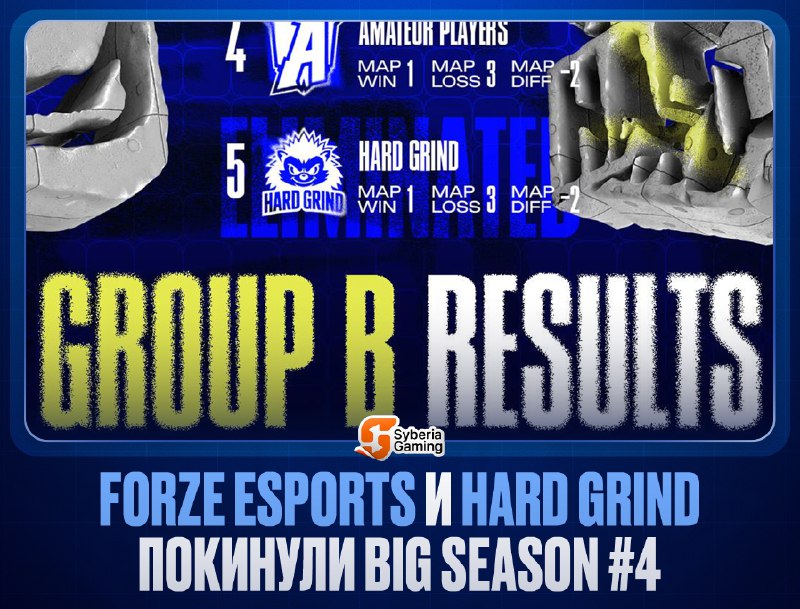 😊 Групповой этап BIG SEASON #4 завершён! 🏆 По итогам групп турнир покинули 💥 HARD GRIND и, неожиданно, 💥 Forze Esports. В Play-Off стадию прошли: 💥Team Spirit 💥 Evil Kings 🐊 Cyberhero 🐵Vers