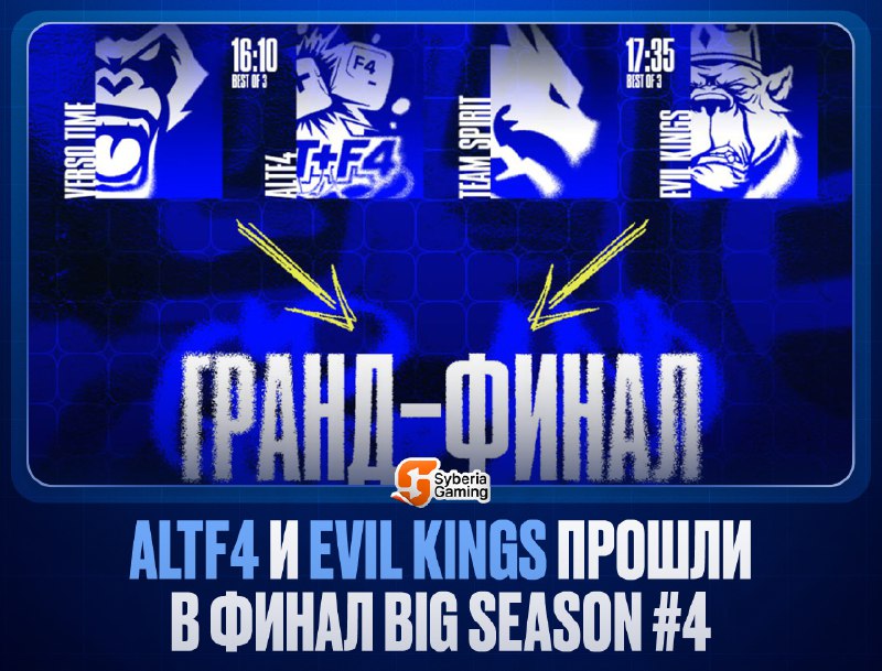 🐱 Финал BIG SEASON #4! В гранд-финал турнира прошли AltF4 и Evil Kings, выбив Amateur Players, TSA Black, The Souless Team и Cyberhero. Сегодня нас ожидают следующие матчи: 🇷🇺 Verso Time vs 💥 Al