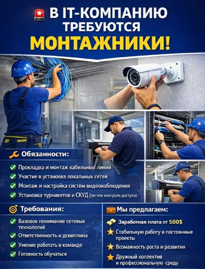 🚨 В IT-компанию требуются МОНТАЖНИКИ! 📍 Локация: г. Ташкент 🕘 График работы: 09:00 – 18:00 🔧 Обязанности: ✅ Прокладка и монтаж кабельных линий ✅ Участие в установке локальных сетей ✅ Монтаж и на