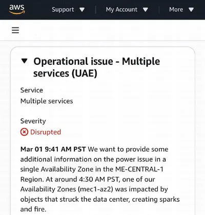 Серверы Amazon снова упали, но в этот раз не из-за вайбкодинга ИИ, а из-за... попадания в дата-центр иранских ракет. Инцидент произошёл в ОАЭ. Но даже описывая такую ситуацию, компания использовала м