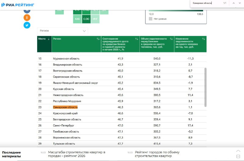 📊 Самарская область заняла 23 место среди регионов РФ в рейтинге РИА «Новости» по соотношению задолженности с годовой зарплатой жителей в 46,3% - в среднем жители региона должны были банкам 365,6 тыс