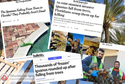 Мы зимой привыкли к снегопаду. А во Флориде недавно прошёл игуанопад 🦎🦎🦎🦎🦎🦎 Из-за аномального похолодания хладнокровные рептилии впадают в оцепенение и теряют способность держаться за ветки (на