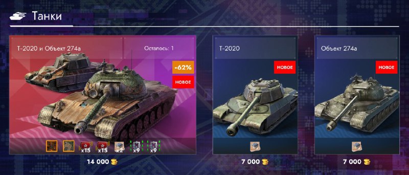 🤩 Сегодня во внутриигровой магазин завезли очередной набор с Т-2020 и Объект 274а Цена: 14000💰 (~4076💸) 🧐Танки довольно средние. СТ – понерфленный в броне. ТТ – неплохой конкурент ИС-ам. 😐Брат