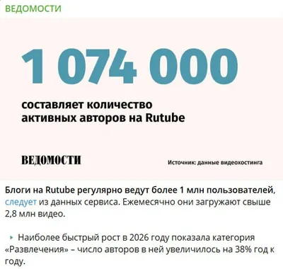 Rutube рассказали Ведомостям, что на их платформе регулярно ведут блоги более 1 млн пользователей. Ежемесячно они загружают свыше 2,8 млн видео. ➡️ В 2025 году Rutube выплатил авторам почти 1,5 млрд