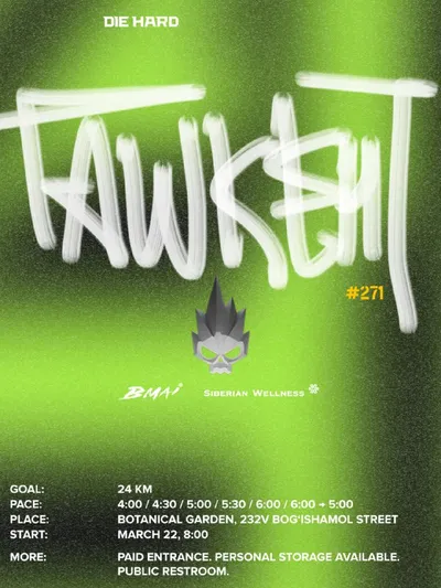 DIE HARD TASHKENT #271 🌐 Registration: https://diehard.run/trainings ⏳ Briefing and photo at 7:50 AM 🕘 Start at 8:00 AM 📌 Greenhouse, Botanical Garden 🎽 Changing rooms open at 7:30 AM (2,000 UZS