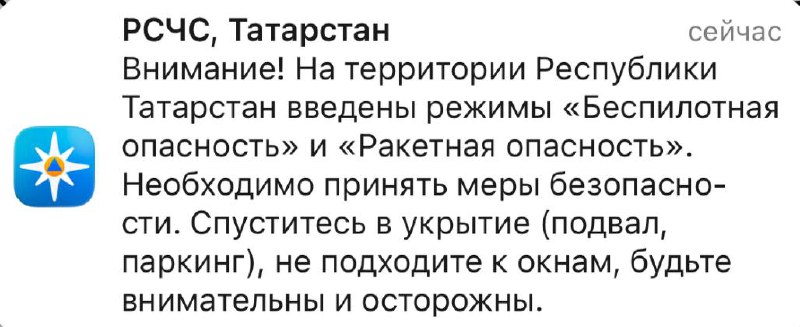 Экстренная информация РСЧС: Внимание! На территории Республики Татарстан введены режимы «Беспилотная опасность» и «Ракетная опасность». Необходимо принять меры безопасности. Спуститесь в укрытие (по