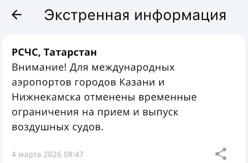 ✈️ Аэропорты Казани и Нижнекамска открыли для приема и выпуска воздушных судов, сообщает Росавиация