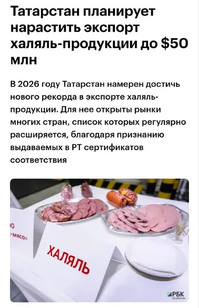 ✅ Татарстан в этом году планирует нарастить экспорт халяль-продукции до $50 млн, сообщили минсельхозпрод РТ. «Стратегия развития халяль-продукции интегрирована в общий план увеличения объемов экспо