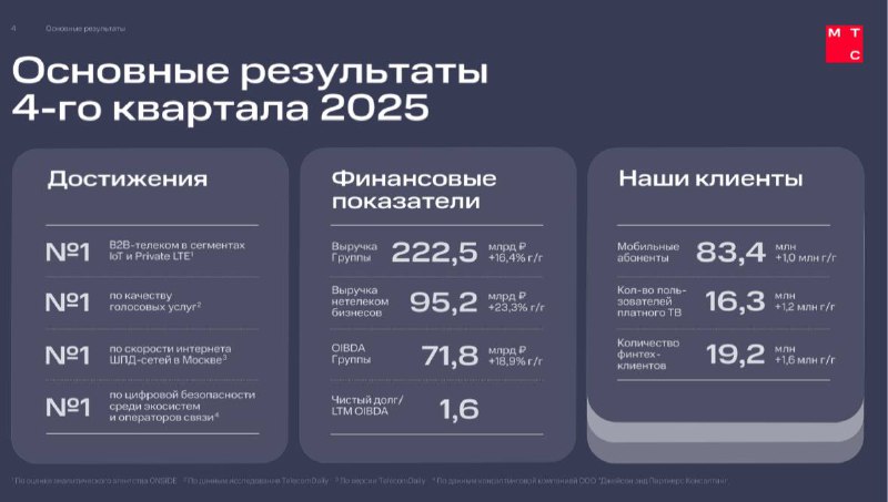 ☎️ МТС (MTSS) | Кратко по результатам 2025 года ▫️Капитализация: 457 млрд ₽ / 229р за акцию ▫️Выручка: 807,2 млрд р (+14,7% г/г) ▫️OIBDA: 279,7 млрд р (+13,5% г/г) ▫️Прибыль: 35,2 млрд р (-28% г/г) ▫
