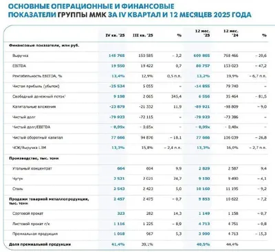 ⚒️ Есть ли что-то хорошее в отчёте ММК за 2025й год? ▫️Капитализация: 337 млрд ₽ / 30,2₽ за акцию ▫️Выручка: 609,9 млрд ₽ (-20,6% г/г) ▫️EBITDA: 80,8 млрд ₽ (-47,2% г/г) ▫️Убыток: 14,9 млрд ₽ ▫️Ск