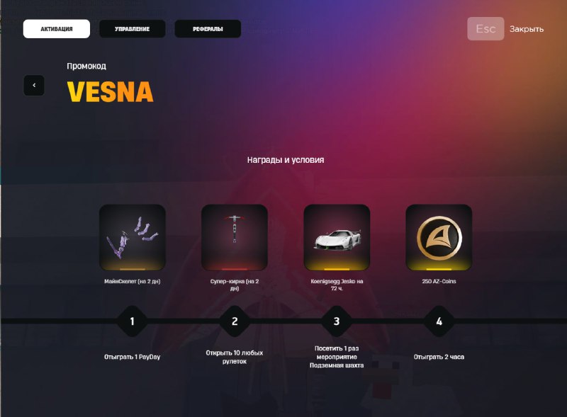 ⛏️ В меню /present доступен новый промокод — VESNA который даёт 4 задания. При выполнении этих заданий вы можете получить ценные призы: • Майн Скелет • Супер кирка • Koenigsegg Jesko • 250 AZ-coins