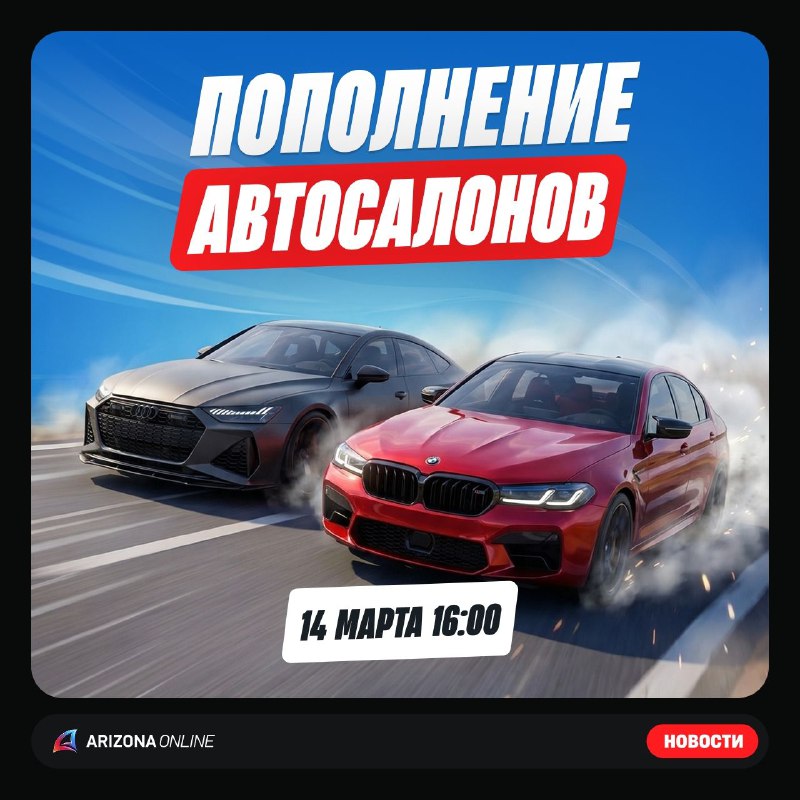 🚗 14 марта в 16:00 состоится пополнение всех автосалонов на всех серверах Аризоны! Тайное Логово 😁 Arizona Online