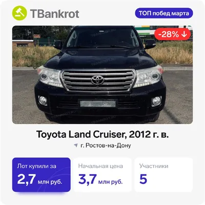 ТОП-5 побед марта на торгах 🏆 1️⃣ Toyota Land Cruiser, 2012 г. в. 🔹 Лот купили за 2,7 млн ₽ 🔹 –28% от начальной цены (дешевле на 1 млн ₽) 🔹 В торгах было 5 участников 👉 https://clck.ru/3Sv8ch