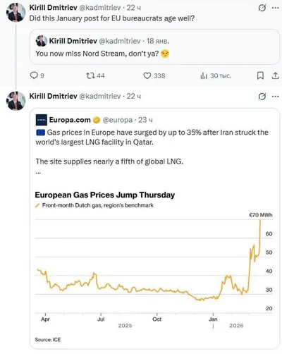 "Скучаете по Северному Потоку, не правда ли?" Кирилл Дмитриев потешается над ЕС после роста цен на газ на 35%.