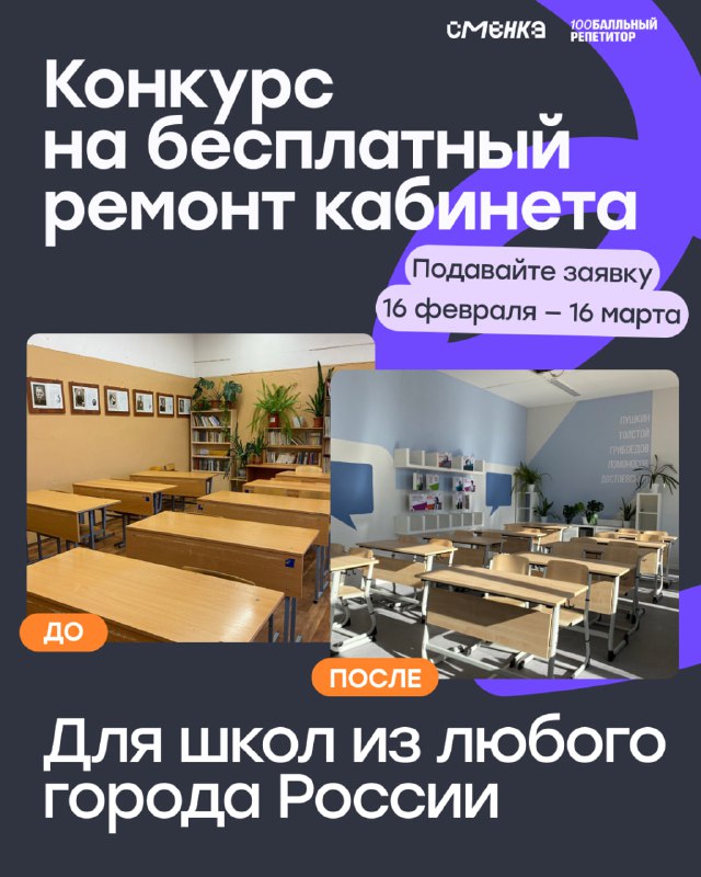 Конкурс для школ: 5 бесплатных ремонтов кабинетов Если вашей школе нужен ремонт кабинета, есть возможность подать заявку на всероссийский конкурс «Школа на 100 баллов». Будут выбраны 5 школ-победител