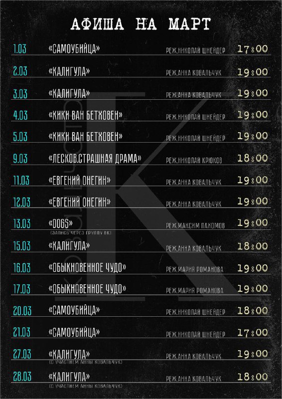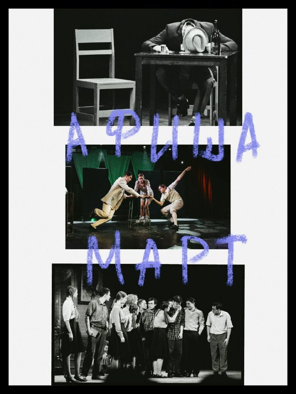 Афиша на март студентов выпускного курса н.а РФ Анны Леонидовны Ковальчук. 📅 1, 21 марта в 17:00 и 20 марта в 18:00 «Самоубийца» Режиссер: Николай Шнейдер Билеты: https://www.gikit.ru/afisha/samoub