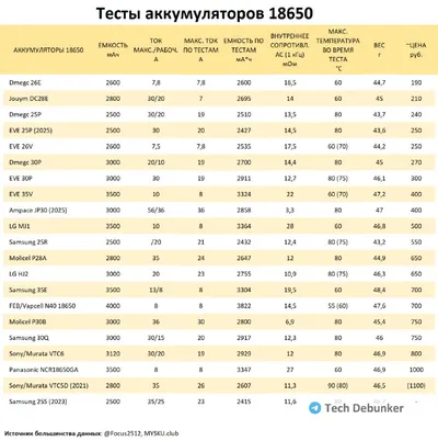 Тесты брендовых аккумуляторов 18650 Наткнулся на тест большого числа аккумуляторов 18650, который мне показался весьма адекватным. Уточнил у автора его методику, пересобрал таблицу, добавил в нее цен