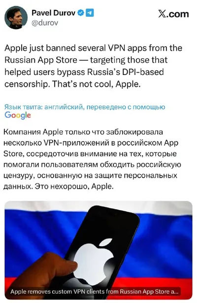 «Это не круто, Apple», — Дуров раскритиковал компанию Тима Кука за удаление VPN-приложений из российского App Store. В своем письме Apple объяснила, что одно из приложений удалено по требованию Роско