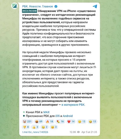 ❗️Минцифры НЕ может полноценно выявлять VPN на iPhone — такая возможность «существенно ограничена» из-за политики конфиденциальности Apple, пишет РБК. Это следует из методических рекомендаций по выяв