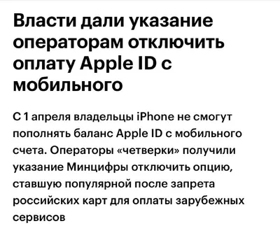 ⚡️⚡️С 1 апреля яблочники НЕ СМОГУТ пополнять баланс Apple ID с мобильного счета — об этом сообщает РБК. Мобильные операторы «большой четверки» получили указание Минцифры отключить такую опцию. Осно