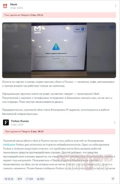 РКН потребовал УДАЛИТЬ посты о связи сбоя банков с блокировками — об этом пишет «Осторожно, новости». По данным издания, РКН посчитал статьи о связи сбоев с борьбой против VPN направленными на «деста