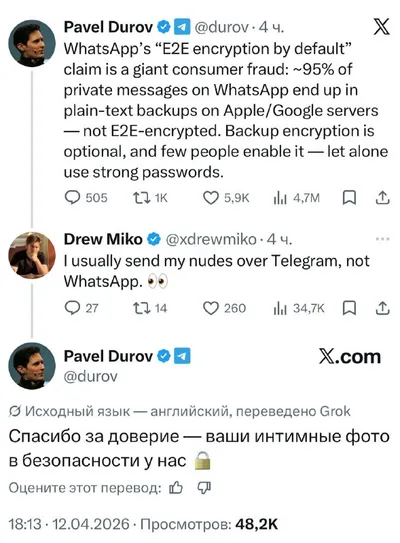 Скидывать НЮДСЫ в Telegram советует Дуров — по его словам, здесь они точно в БЕЗОПАСНОСТИ. Павел ответил в Х разрабу, который признался, что отправляет свои интимки именно через Telegram, а не через