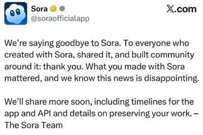 Sora больше нет 😢 OpenAI приняла решение закрыть видео-генератор. Причина — проект так и не смог завоевать популярность у пользователей из-за строгих ограничений на использование интеллектуальной со
