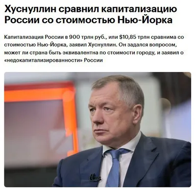 ⚡️ Вся Россия стоит как один НЬЮ-ЙОРК — считает вице-премьер Марат Хуснуллин. Он заявил, что в начале этого года капитализация страны превысила чуть больше 💚💚💚 триллионов: «Много это или мало?