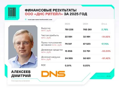 ООО «ДНС Ритейл» отчиталось о финансовых результатах за 2025 год (РСБУ). ▶️Выручка выросла умеренно – с 760,3 млрд руб. до 781,2 млрд руб. (+2,8%). При этом себестоимость увеличилась сопоставимыми те